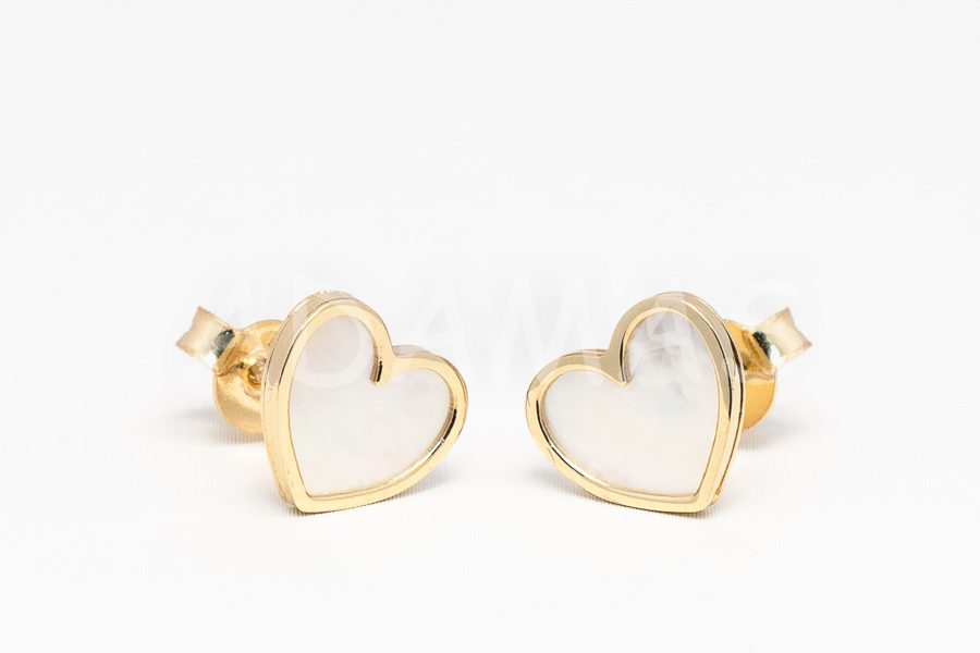 Napichovacie náušnice zlaté – srdce s bielym perleťovým emailom
